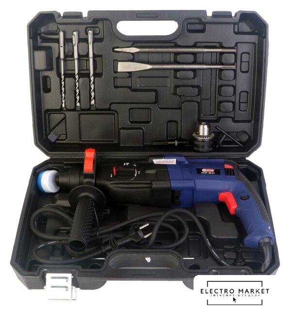 | Комплект поставки | - Руководство по эксплуатации;- Адреса гарантийных мастерских;- Патрон сверлильный с ключом;- Переходник к сверлильному патрону;- Глубиномер;- Зубило плоское;- Зубило пикообразное;- Упаковка (кейс);- Буры с хвостовиком типа SDS-plus (6 мм; 8 мм; 10 мм) - 3;- Дополнительная рукоятка;- Винт М6x20 резьба левая;- Перфоратор. |