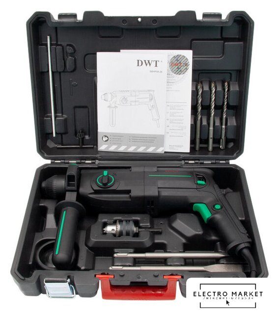 | Комплект поставки | - Перфоратор 1шт. - Инструкция по эксплуатации 1 шт. - Ограничитель глубины 1шт. - Дополнительная рукоятка 1шт. - Сверла 3 шт. - Зубило пика 1 шт. - Зубило плоское 1шт. - Пылеуловитель 1 шт. - Зубчатовенцовый патрон (с - хвостовиком SDS PLUS) 1 шт. - Зажимной ключ 1шт. - Винт 1шт. - Адаптер SDS PLUS 1 шт. |