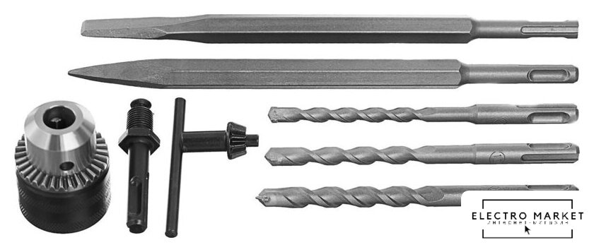 | Комплект поставки | - Перфоратор;- Рукоятка дополнительная;- Ограничитель глубины;- Патрон трехкулачковый;- Ключ патрона;- Адаптер ключевого патрона;- Набор оснастки;- Инструкция;- Кейс. |