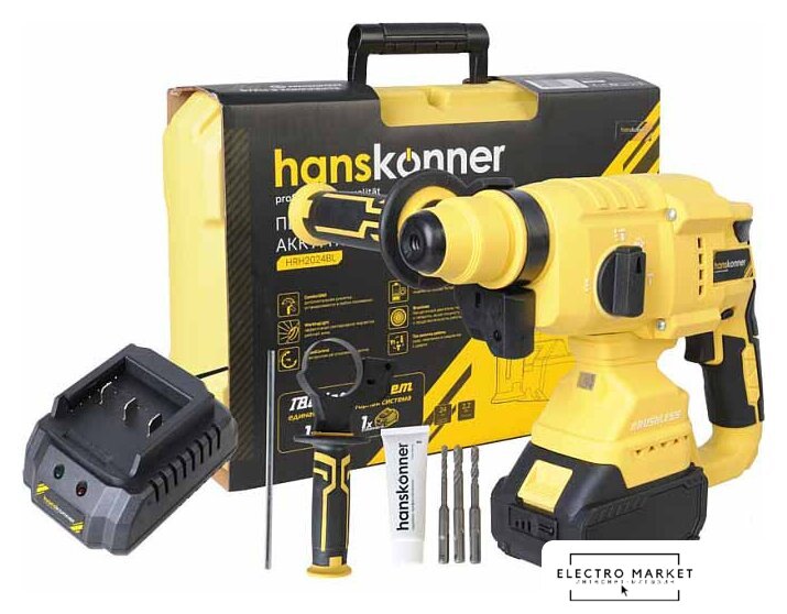| Комплект поставки | - буры SDS Plus (3 шт), - боковая рукоятка, - смазка для хвостовиков буров,- ограничитель глубины сверления, - аккумуляторная батарея 4 Ач, - зарядное устройство, - кейс |