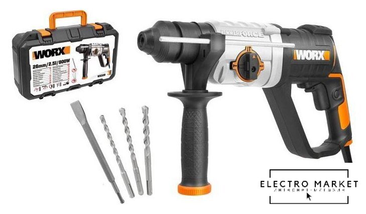 | Комплект поставки | - Перфоратор WORX WX339;- Дополнительная ручка;- Ограничитель глубины сверления;- 3 SDS сверла;- 1 SDS плоское зубило;- Пластиковый бокс. |
