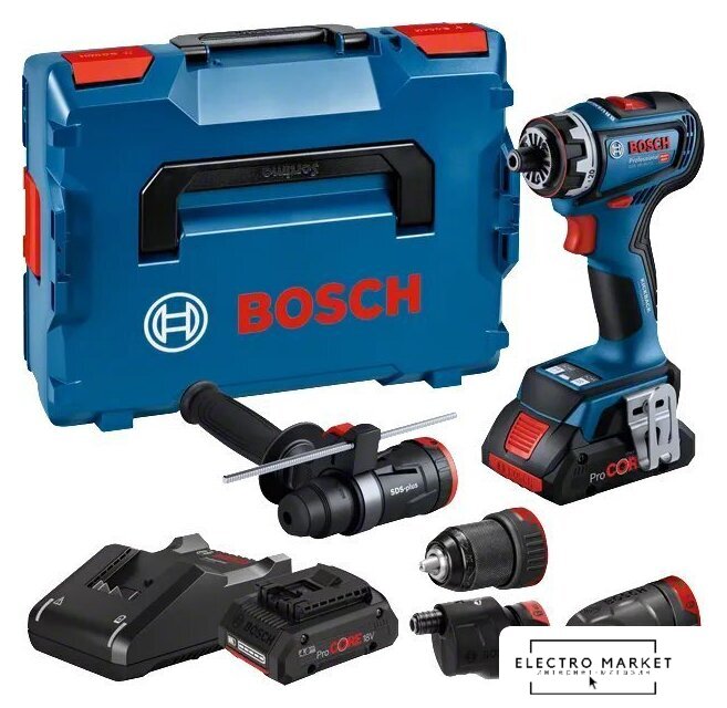 Комплектация | - кейс L-BOXX 136- 2 аккумулятора ProCORE18V 4,0 Ач- з/у GAL 18V-40 Professional- сменный БЗП GFA 18-M Professional- сменный угловой патрон GFA 18-W Professional- сменный эксцентриковый патрон GFA 18-E Professional- сменный SDS-Plus патрон GFA 18-H Professional |