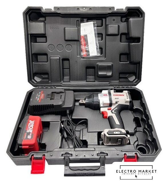 | Комплектация | - Аккумуляторный ударный гайковерт, - Аккумуляторs 8Ач - 1шт, - Зарядное устройство 4А, - Руководство пользователя, - Гарантийный талон, - Кейс |