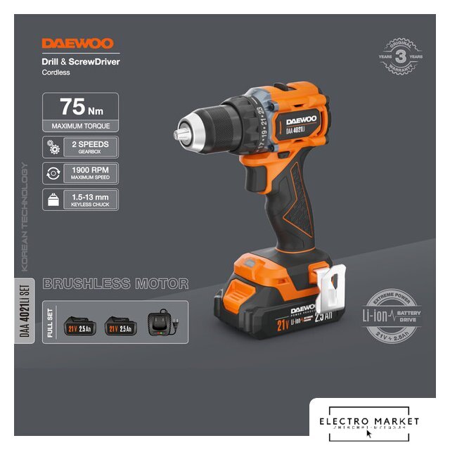 | Комплектация | - Дрель-шуруповерт - 1 шт.- Аккумулятор 2,5 Ач - 2 шт.- Зарядное устройство - 1 шт.- Скоба для крепления - 1 шт.- Инструкция- Кейс |
