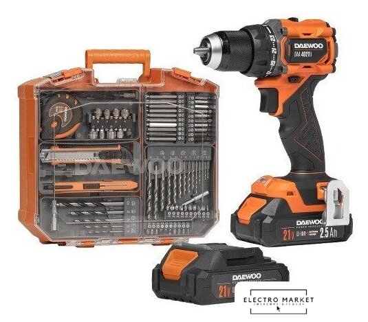 | Комплектация | - Дрель-шуруповерт - 1 шт.- Аккумулятор 2,5 Ач - 2 шт.- Зарядное устройство - 1 шт.- Комплект бит и инструмента - 1 шт.- Скоба для крепления - 1 шт.- Инструкция- Кейс |