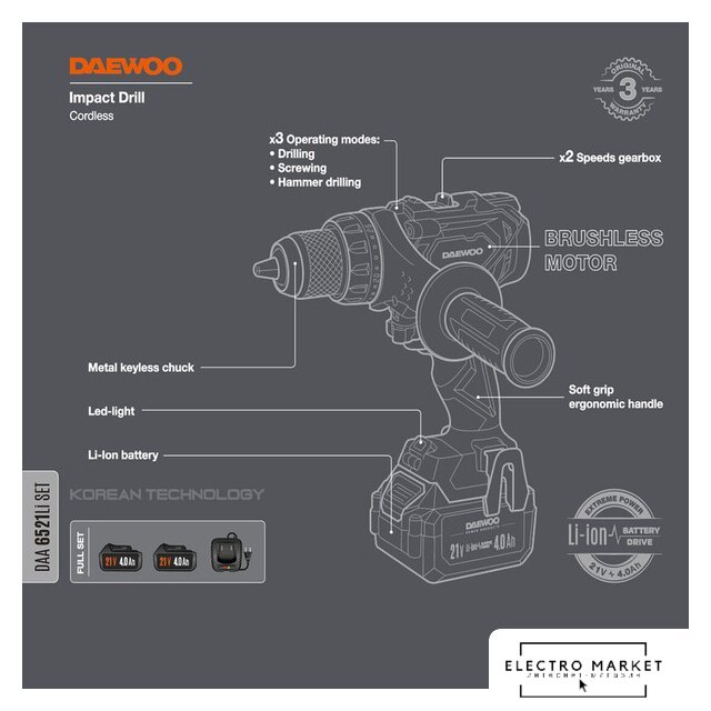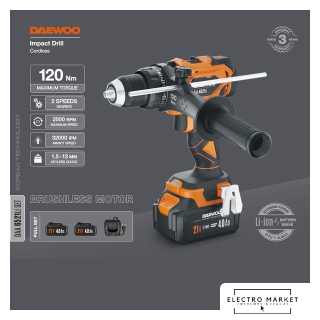 Комплектация | - Дрель-шуруповерт - 1 шт.- Аккумулятор 4,0 Ач - 2 шт.- Зарядное устройство - 1 шт.- Дополнительная рукоятка - 1 шт.- Скоба для крепления - 1 шт.- Инструкция- Кейс |