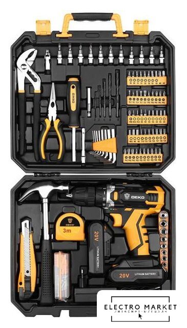 Комплектация | Дрель-шуруповерт 1 шт зарядное устройство2 шт аккумулятор11 шт 1/4" биты: SL4,5.5, PH1,2, PZ1,2, H3,4, T10,15,20,1 шт 1/4" универсальный шарнир,1 шт магнитный держатель бит 60мм,1 шт 1/4" x3 удлинитель,1 шт переставной ключ,1 шт 6" плоскогубцы,1 шт держатель бит 6,35 мм,Шестигранные ключи: 1,5-6 мм,5 шт сверла: 2,3,4,5,6мм,50 шт 25L биты: SL3,3,4,5,6, PH0,0,1,1,2,2,3,3, PZ0,0,1,1,2,2,3,3, H1,5, 1,5,2,2,3,4,4,5,5,5,5,6,6, T10,15,20,25,27,30,35, S0,0,1,1,2,2,3, 3, AD, AD, 9 шт. 1/4" розетки: 5,6,7,8,9,10,11,12,13 мм,1 шт измерительная лента 3м,1 шт молоток,1 шт строительный нож 18мм,103 шт крепежКейс |