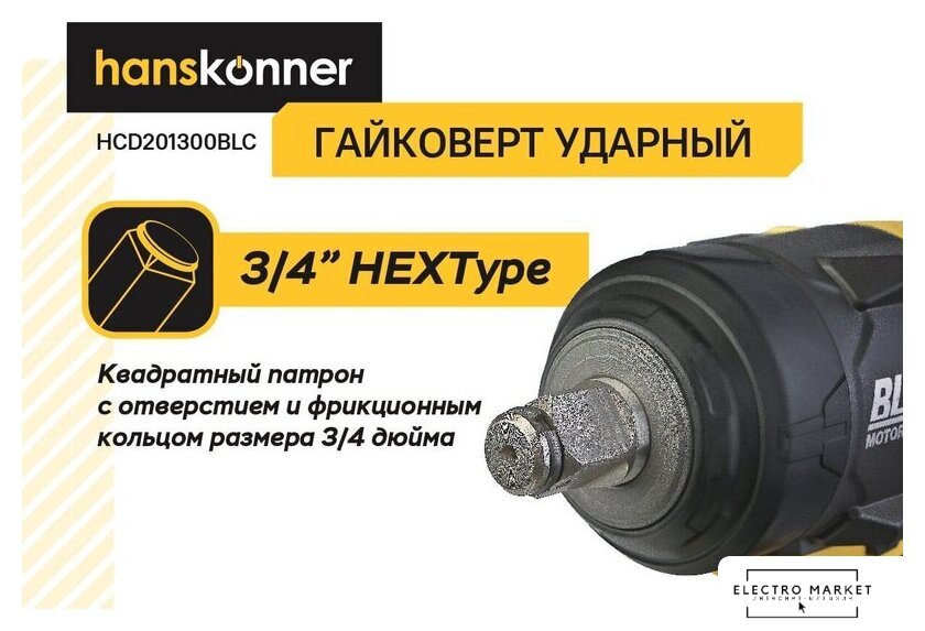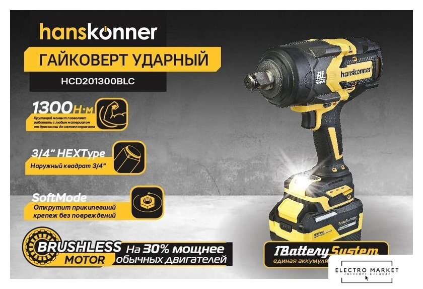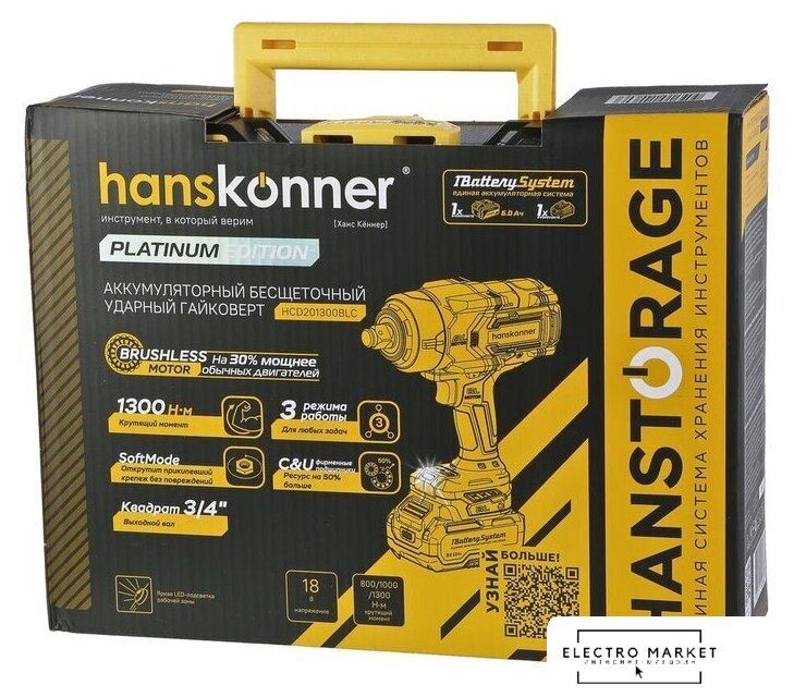 | Комплектация | - Гайковерт, - Зарядное устройство (1 шт), - Аккумуляторная батарея (1 шт), - USB LED-фонарик (1 шт.), - Кейс Hanstorage, - Инструкция по эксплуатации, - Инструкция по безопасности |