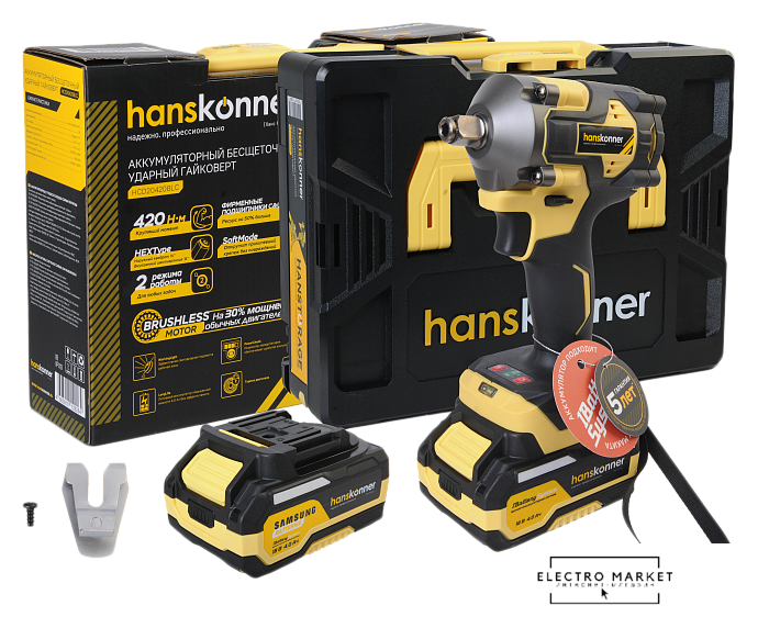 Комплектация | - Аккумуляторный ударный гайковерт (1 шт)- Аккумуляторная батарея (1 шт)- Зарядное устройство (1 шт)- Скоба (1 шт)- Фиксирующий винт (1 шт)- USB LED-фонарик (1 шт)- Кейс |