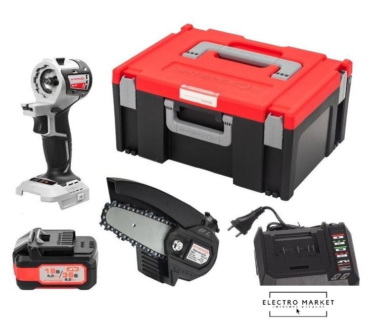 Комплектация | - Привод ММ-18ВМ - 1 шт.- Модуль цепной пилы ПЦА-4 - 1 шт.- Аккумулятор 18/36 В 4/2 Ач - 1 шт.- Зарядное устройство - 1 шт.- Кейс - 1 шт. |