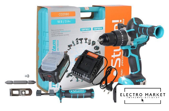 Комплектация | - дрель-шуруповерт аккумуляторная, - аккумуляторная батарея (2 шт, одна подсоединена к шуруповерту), - зарядное устройство, - двойная бита, - дополнительная рукоятка, - кейс |