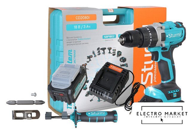 | Комплектация | - дрель-шуруповерт аккумуляторная, - аккумуляторная батарея (2 шт, одна подсоединена к шуруповерту), - зарядное устройство, - двойная бита, - дополнительная рукоятка, - кейс |