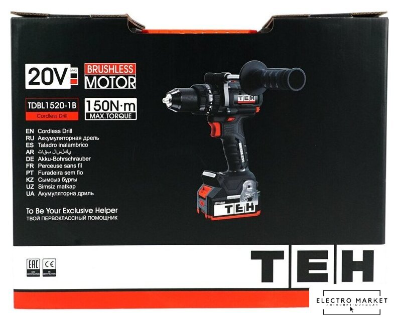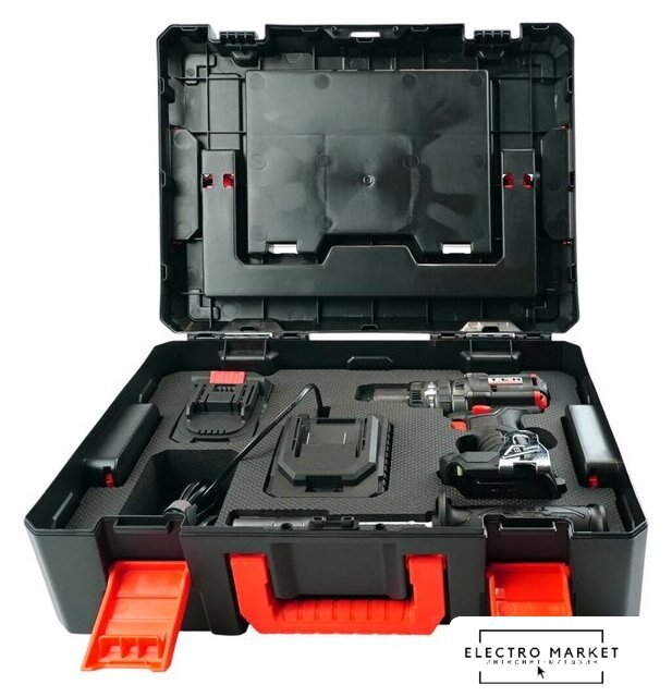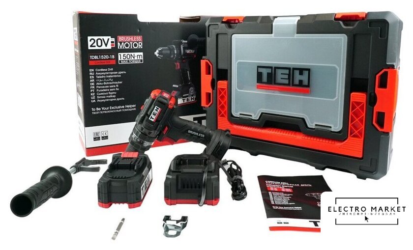 | Комплектация | - Дрель аккумуляторная;, - Аккумуляторная батарея 4Ач;, - Зарядное устройство 4A;, - Боковая рукоятка;, - Крюк для ремня;, - Руководство по эксплуатации;, - Пластиковый кейс ТЕН STACK. |