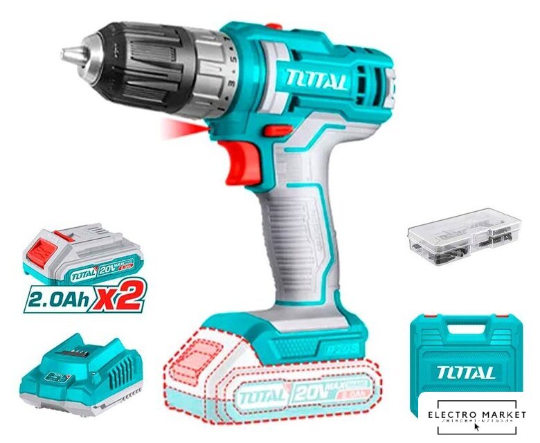 Комплектация | Дрель-шуруповерт - 1 шт.Аккумулятор 2,0 А*ч - 2 шт.Быстрое интеллектуальное зарядное устройство - 1 шт.Аксессуары - 47 шт.ИнструкцияКейс |