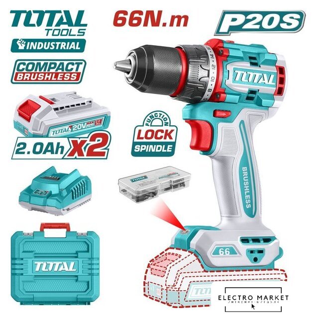 | Комплектация | - Дрель-шуруповерт - 1 шт.- Аккумулятор 2,0 Ач - 2 шт.- Зарядное устройство - 1 шт.- Аксессуары - 47 шт.- Инструкция- Кейс |