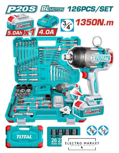 | Комплектация | Аккумуляторный ударный гайковёрт TIWLI201351Аккумулятор 5.0 А·ч — 1 шт. (TFBLI20531)Зарядное устройство 4 А — 1 шт. (TFCLI20411)Ударные головки 3/4":4 шт.: 26, 27, 30, 32 ммГоловки и оснастка 1/2":Трещотка — 1 шт.Универсальный шарнир — 1 шт.Головки — 7 шт.: 21, 22, 23, 24, 27, 30, 32 ммУдлинённые головки — 5 шт.: 14, 15, 17, 19, 21 ммСвечные головки — 2 шт.: 16 мм, 21 ммУдлинители — 2 шт.: 125 мм, 250 ммПереходник — 1 шт.: 3/8"(F) × 1/2"(M)Головки и оснастка 3/8":Трещотка — 1 шт.Универсальный шарнир — 1 шт.Головки — 10 шт.: 10–19 ммУдлинители — 2 шт.: 75 мм, 150 ммБиты и бит-головки:Бит-головки 1/4" × 32 мм — 18 шт.:HEX: 3, 4, 5, 6, 8 ммTORX: T8, T10, T15, T20, T25, T30, T40SL: 5.5, 6.5PH2, PH3PZ2, PZ3Биты 6.35 × 25 мм — 40 шт. (PH, PZ, SL, TORX, HEX)Держатель бит 1/4" — 1 шт. Адаптер 1/4" — 1 шт.: 3/8"(F) × 1/4"(M)Вороток-спиннер 1/4" × 150 мм — 1 шт.Ключи и ручной инструмент:Комбинированные ключи — 12 шт.: 10, 11, 12, 13, 14, 15, 17, 18, 19, 21, 22, 24 ммШестигранные ключи (HEX) — 10 шт.: 2,5–14 ммОтвёртки — 2 шт.: SL6.5×150 мм, PH2×150 ммСъёмник масляного фильтра — 1 шт.Упаковка:Прочный кейс для хранения и транспортировки |