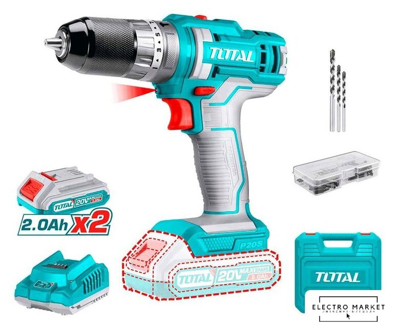 Комплектация | Дрель-шуруповерт - 1 шт.Аккумулятор 2,0 А*ч - 2 шт.Быстрое интеллектуальное зарядное устройство - 1 шт.Сверло - 3 шт.Аксессуары - 47 шт.ИнструкцияКейс |