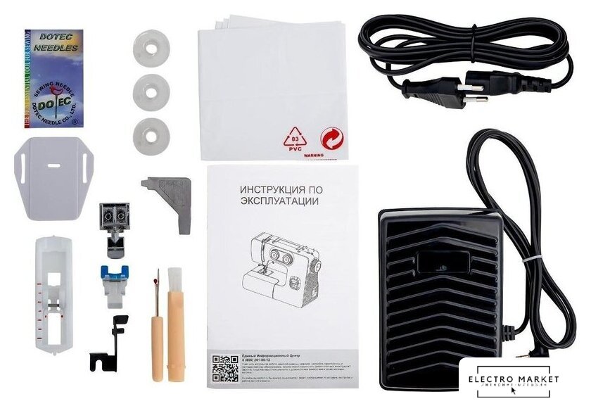 | Комплектация | комплект игл (130/705H), шпулька (3 шт., материал — пластик), педаль, отвертка, щеточка, инструкция, сетевой шнур (длина — 1.4 м), вспарыватель, подсветка рабочей зоны, штопальная пластина |