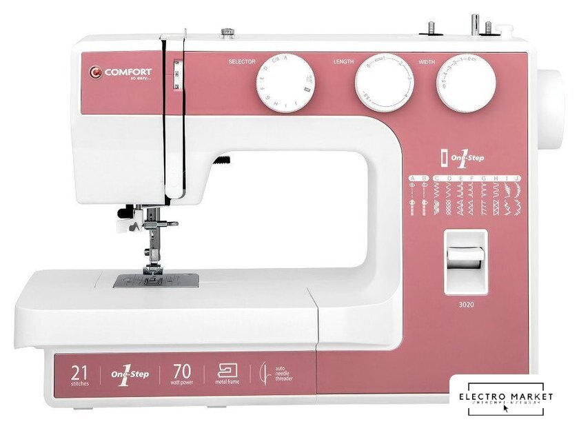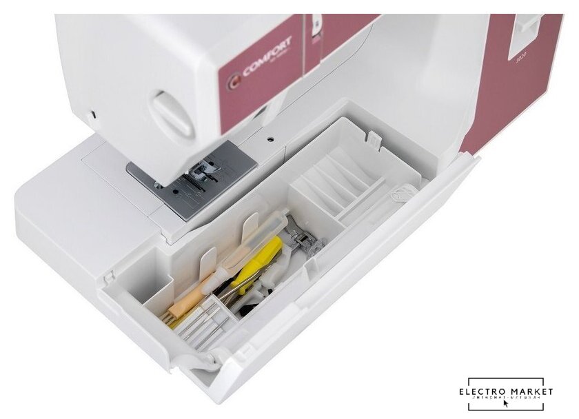механическая, вертикальный качающийся челнок, автоматическое выполнение петли, швейные операции: имитация оверлочной строчки/потайная строчка/трикотажная строчка/декоративная строчка