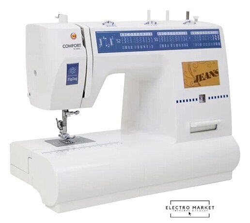 электромеханическая, вертикальный качающийся челнок, полуавтоматическое выполнение петли, швейные операции: имитация оверлочной строчки/потайная строчка/трикотажная строчка/декоративная строчка