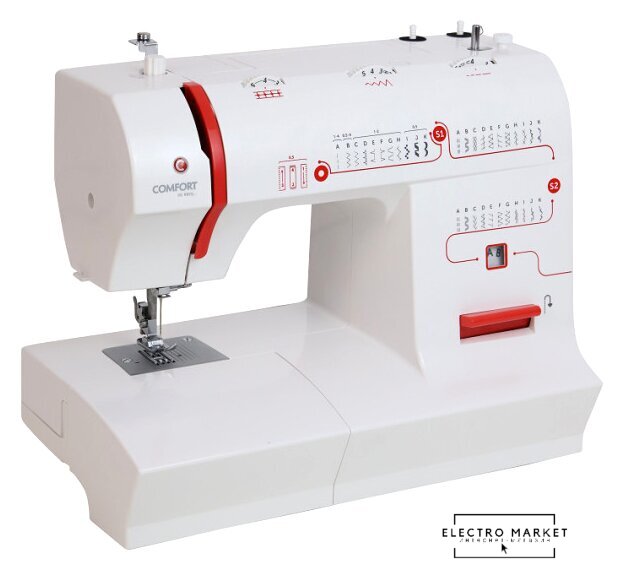 электромеханическая, вертикальный качающийся челнок, полуавтоматическое выполнение петли, швейные операции: имитация оверлочной строчки/потайная строчка/трикотажная строчка/декоративная строчка