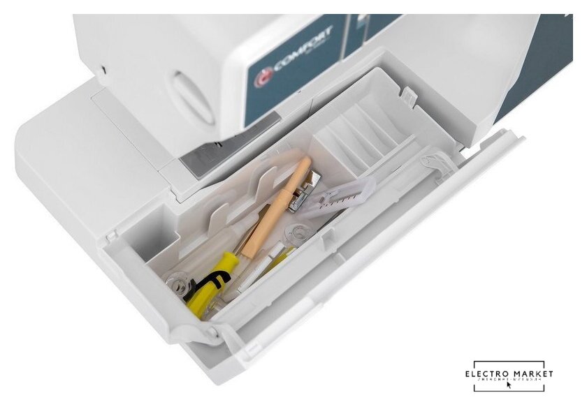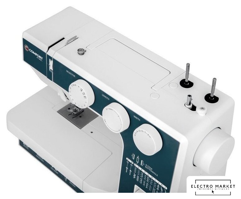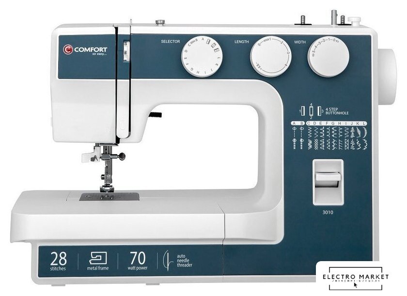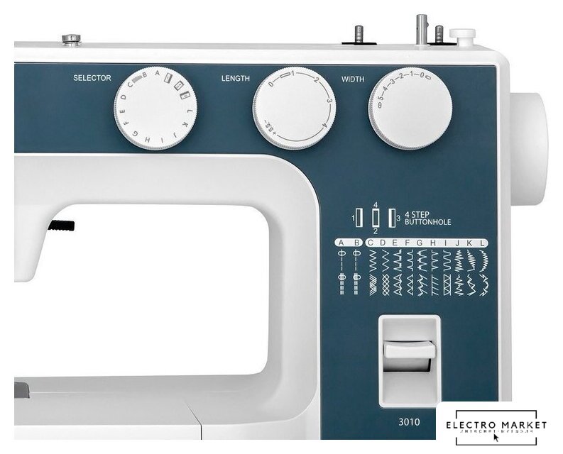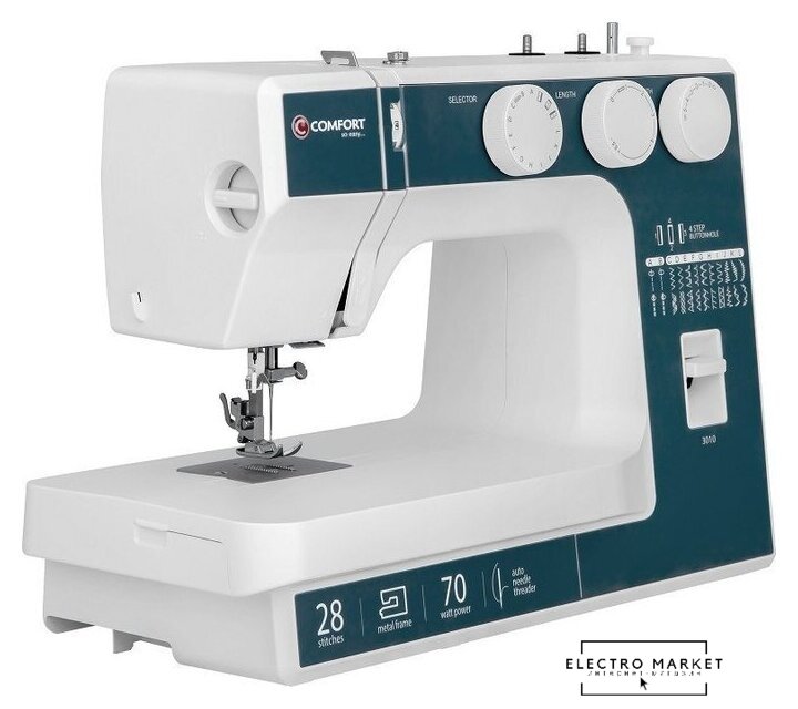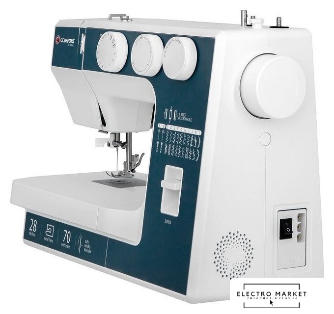 электромеханическая, вертикальный качающийся челнок, полуавтоматическое выполнение петли, швейные операции: потайная строчка/декоративная строчка