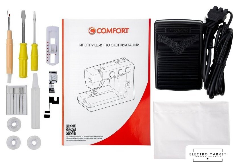 Комплектация | инструкция, распарыватель/кисточка, комплект игл (3 шт.), шпулька (3 шт.), масленка, отвертка (2 шт.), педаль (реостатная ) |