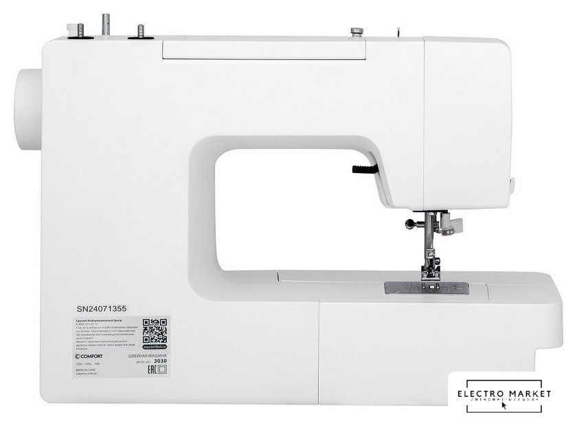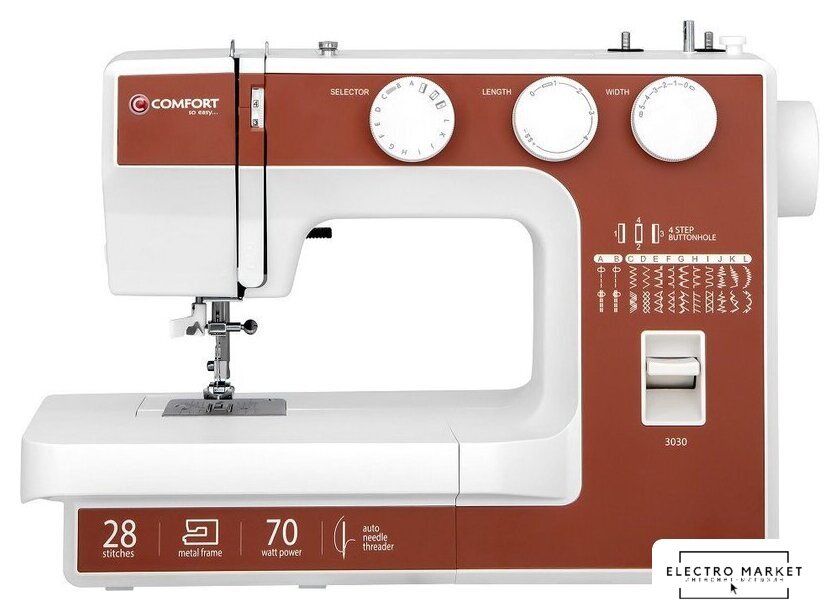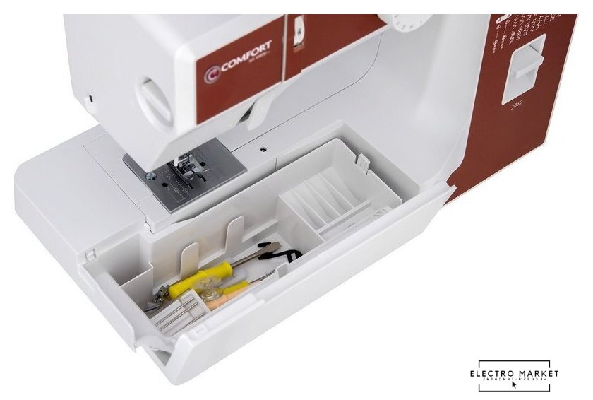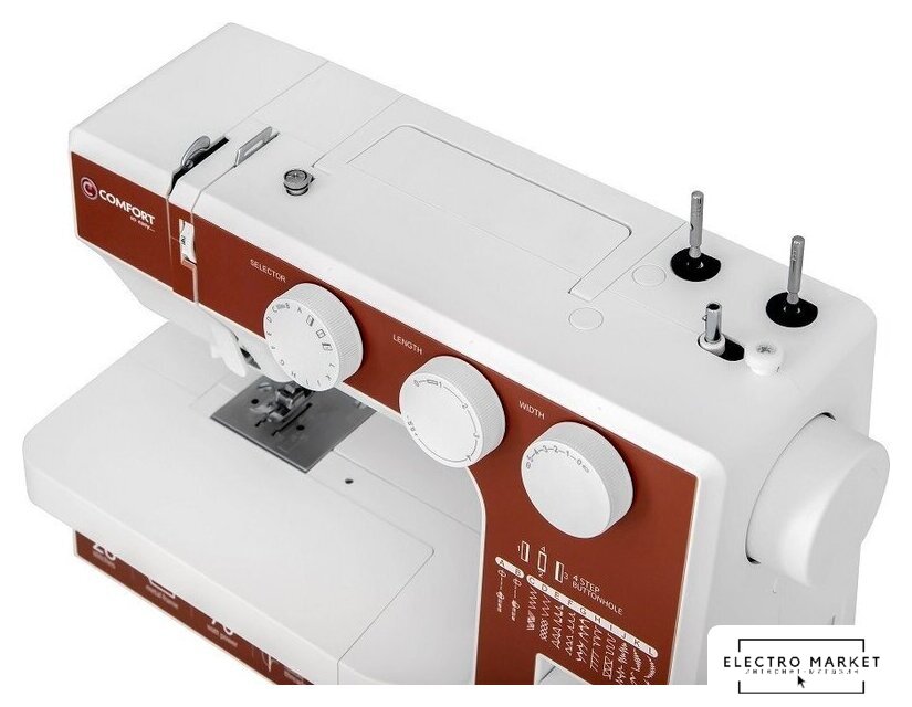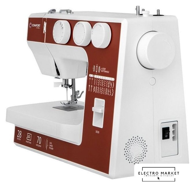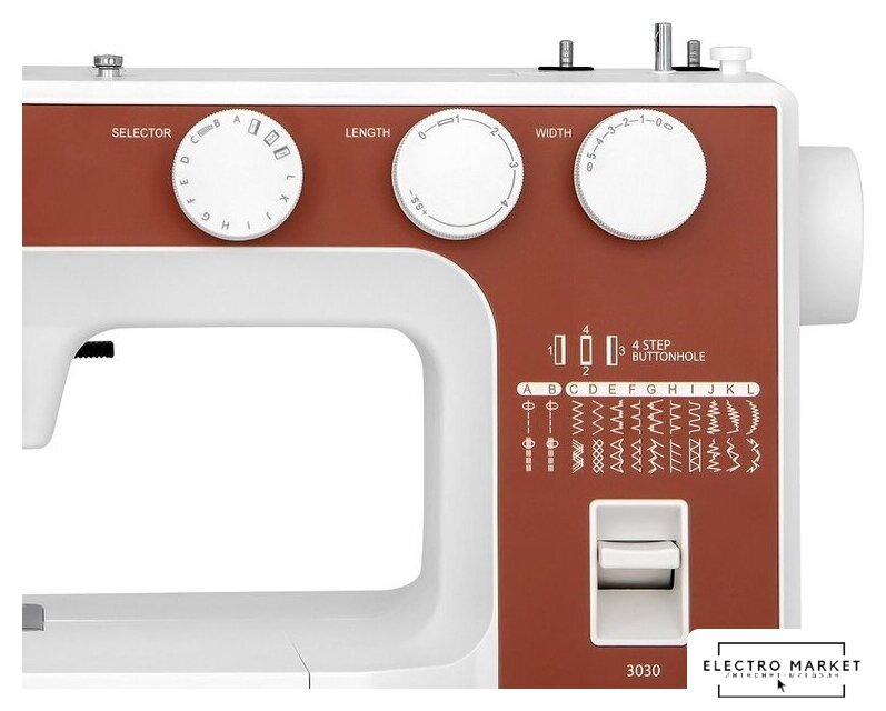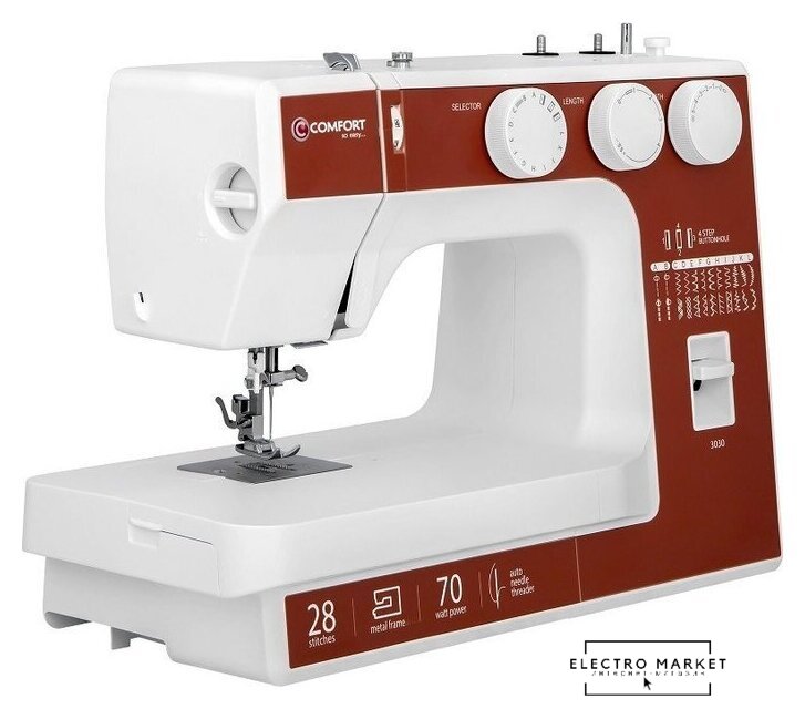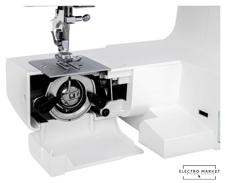электромеханическая, вертикальный качающийся челнок, полуавтоматическое выполнение петли, швейные операции: имитация оверлочной строчки/потайная строчка/трикотажная строчка/декоративная строчка