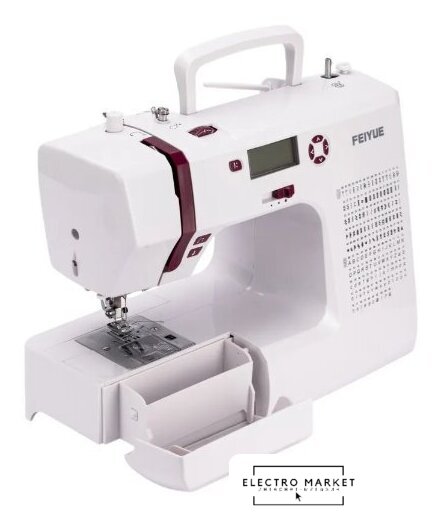 электромеханическая, горизонтальный ротационный челнок, автоматическое выполнение петли, швейные операции: имитация оверлочной строчки/потайная строчка/трикотажная строчка/декоративная строчка/алфавит (латиница)/алфавит (кирилица)