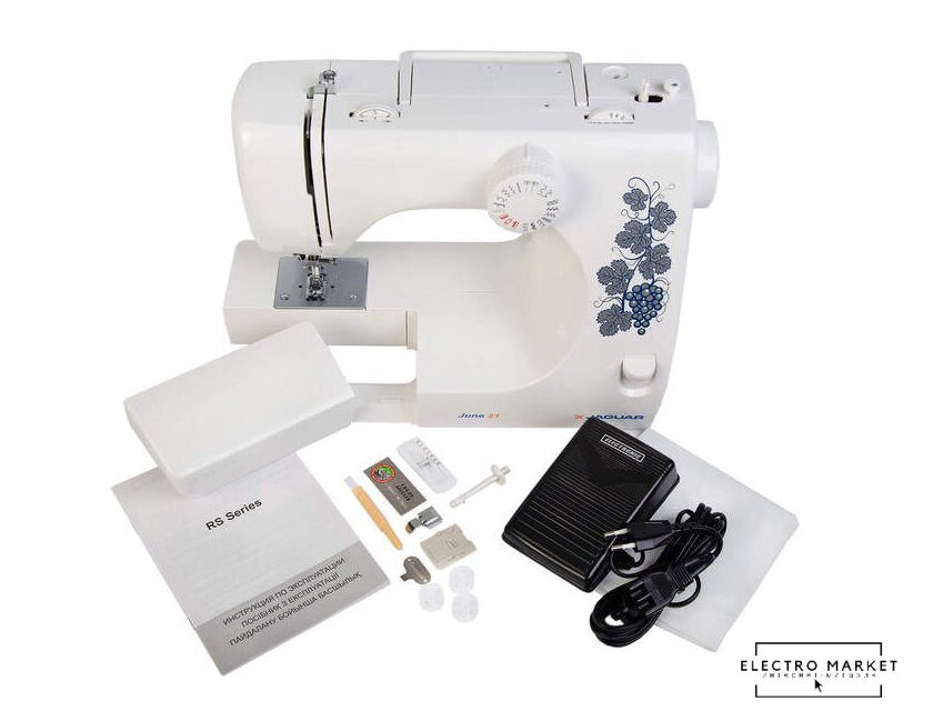 Комплектация | Лапка универсальная (установлена на машине)Лапка для петлиЛапка для вшивания молнииШпульки (3 шт)Набор иглДержатель катушкиВспарывательОтверткаШтопальная пластинаНожная педальИнструкция по эксплуатацииМягкий чехол |