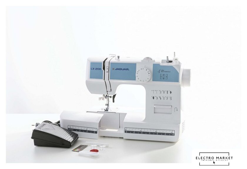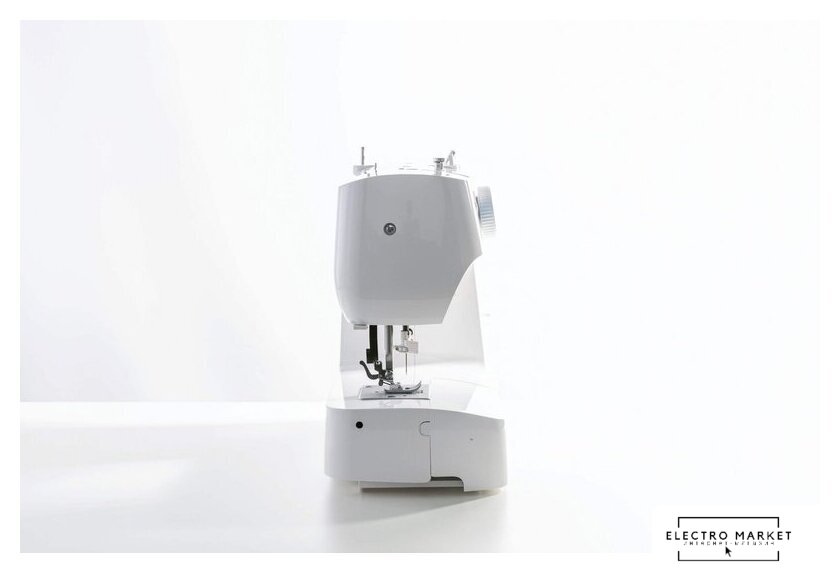 Комплектация | комплект игл (130/705H), шпулька (3 шт.), педаль (кабель — 1 м), щеточка, фетровая прокладка (2 шт.), инструкция, сетевой шнур (1.8 м), вспарыватель, подсветка рабочей зоны, разметочная линейка |