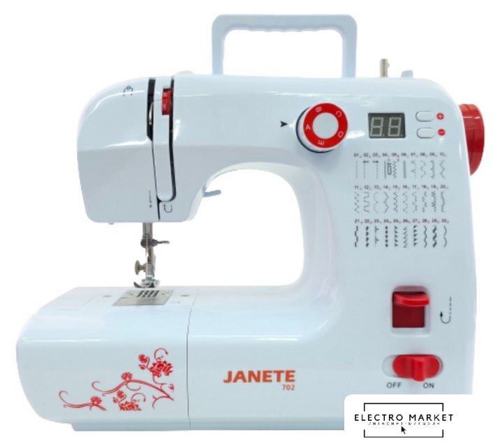 | Комплектация | педаль, шнур питания от сети, 2 катушки, 2 шпульки, ручной нитевдеватель, игла #14, лапка для выметывания петли |