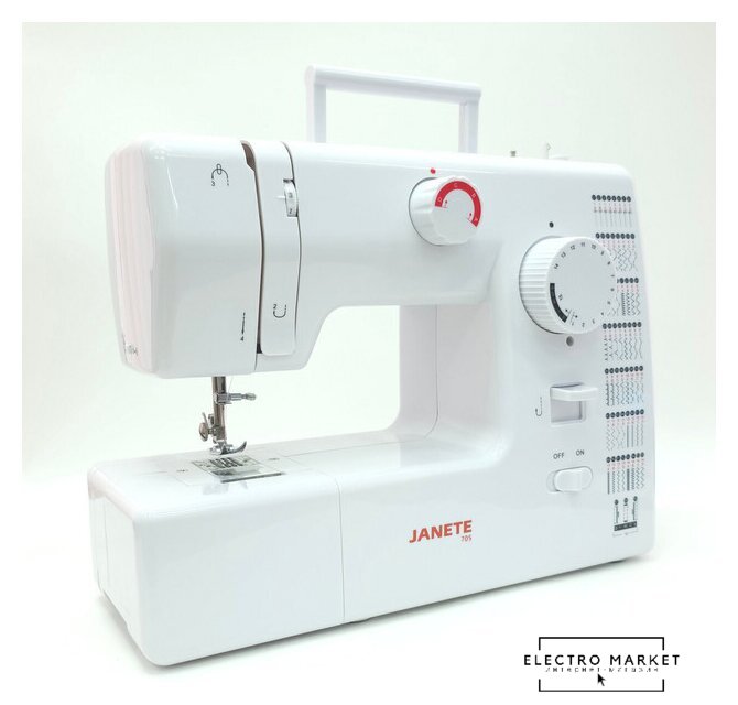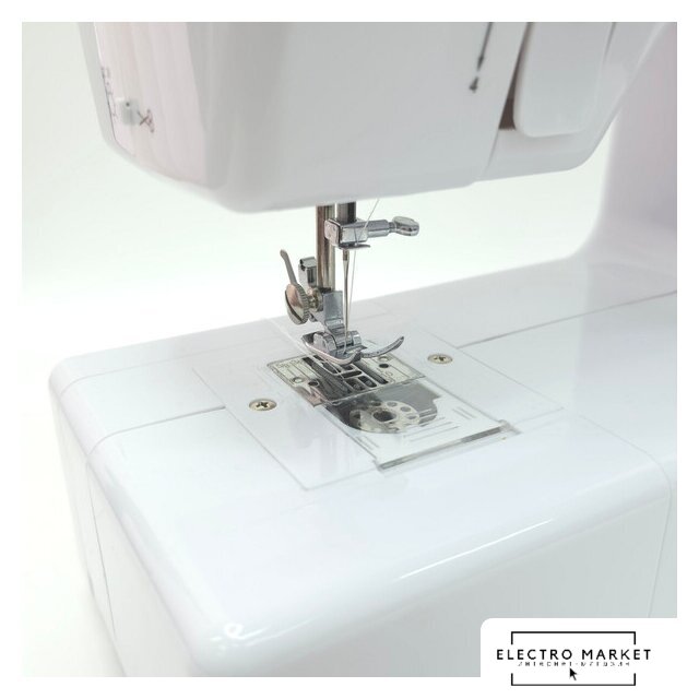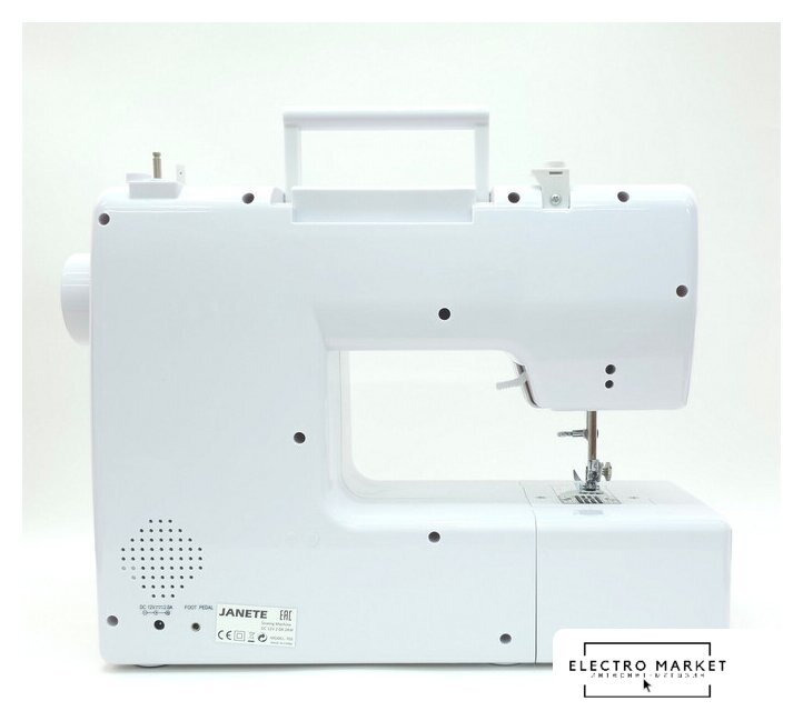 | Комплектация | педаль, шнур питания от сети, 2 катушки, 2 шпульки, ручной нитевдеватель, игла #14, лапка для выметывания петли |