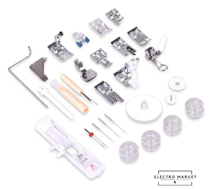 | Лапки | универсальная, для вшивания молнии, для обметывания петель, оверлочная, для потайной строчки, для пришивания пуговиц, для потайной подгибки, для декоративных строчек, для вышивания монограмм, для вшивания шнура |