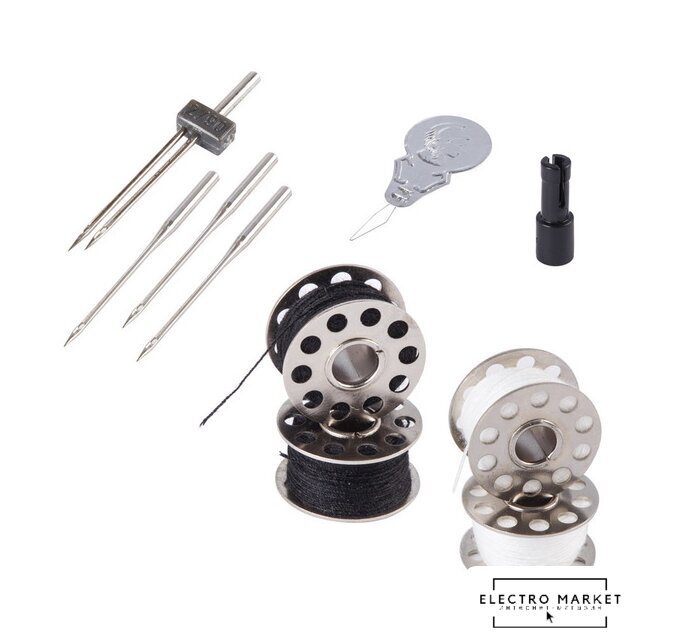 Комплектация | Швейная машина: 1 шт. Ножной привод: 1 шт. Сетевой адаптер питания: 1 шт. Нитевдеватель: 1 шт. Игла: 2 шт. Шпули: 2 шт. Гарантийный талон Руководство по эксплуатации |