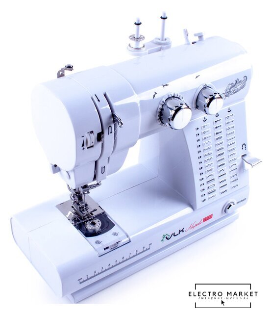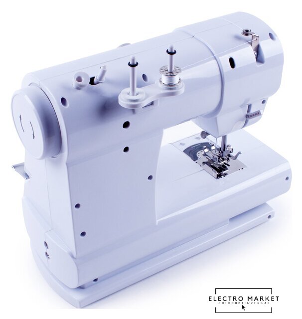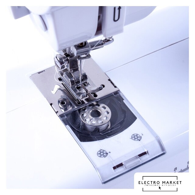 электромеханическая, вертикальный качающийся челнок, полуавтоматическое выполнение петли, швейные операции: имитация оверлочной строчки/потайная строчка/трикотажная строчка/декоративная строчка