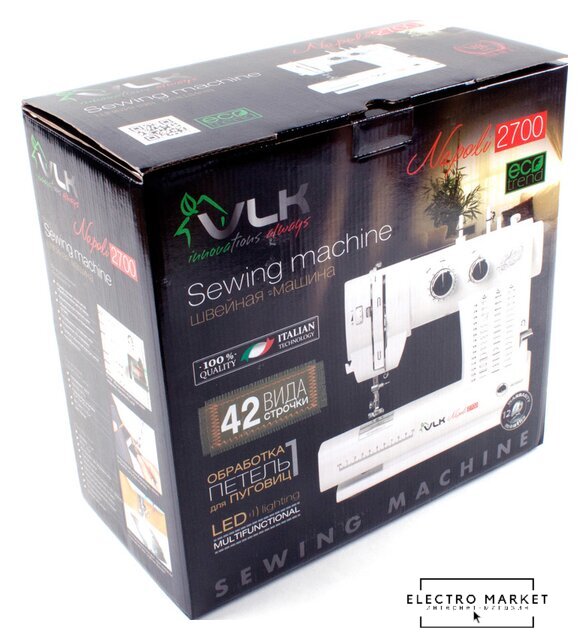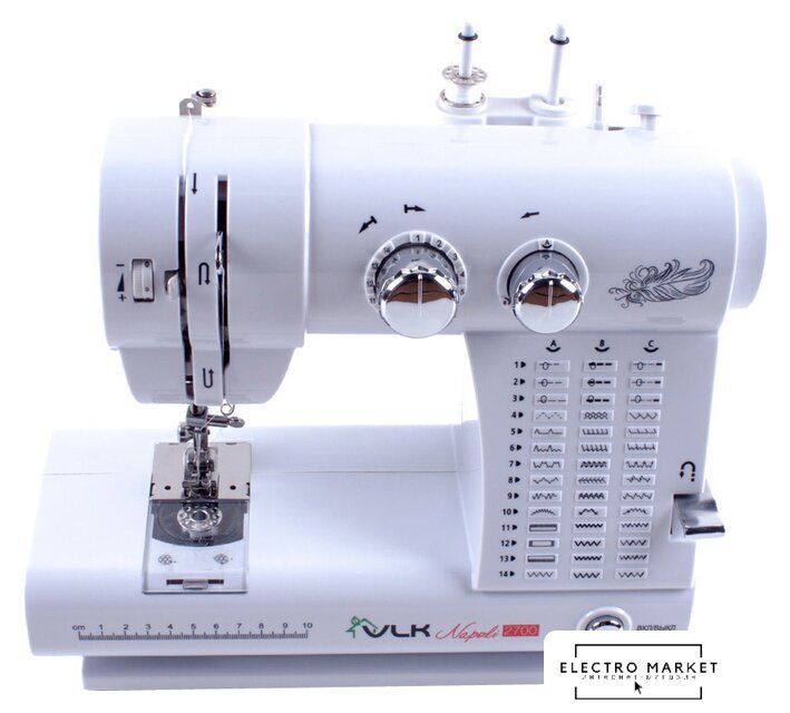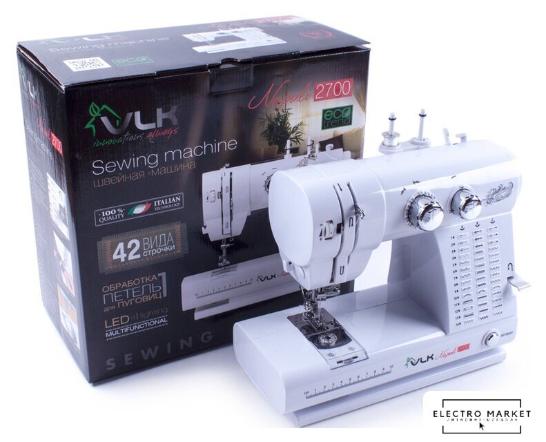 электромеханическая, вертикальный качающийся челнок, полуавтоматическое выполнение петли, швейные операции: потайная строчка/декоративная строчка