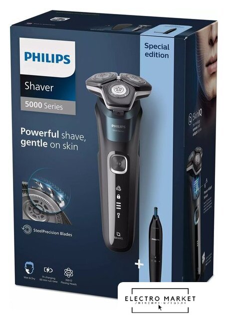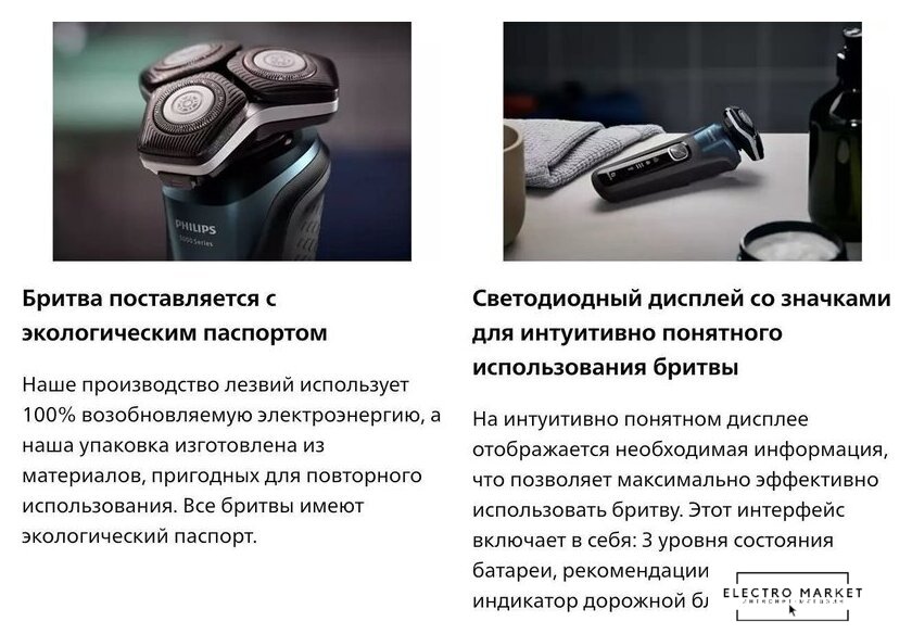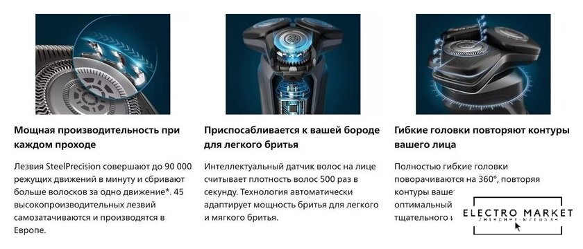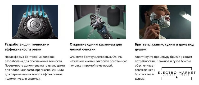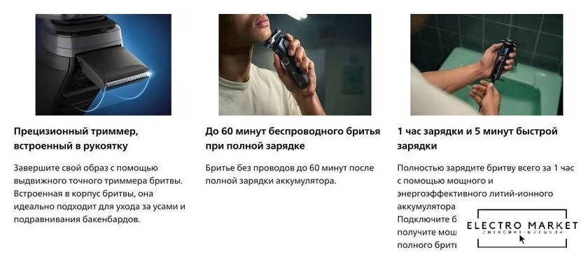 роторная, влажное бритье, сенсор щетины, устройство для автомат. очистки, питание от аккумулятора, 1 час автономной работы