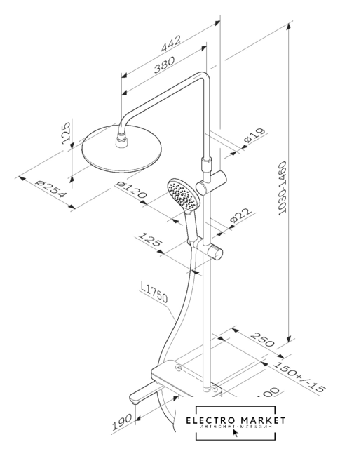 душевая система (с верхним душем), настенный монтаж, термостатический смеситель, верхний душ 250 мм, ручной душ 120 мм