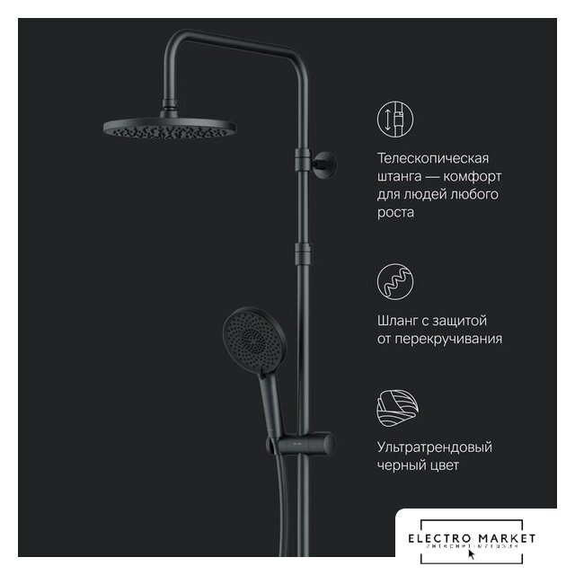 Комплектация | верхний душ, штанга, ручной душ (лейка), держатель лейки, шланг, смеситель |