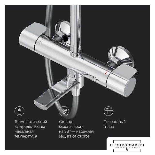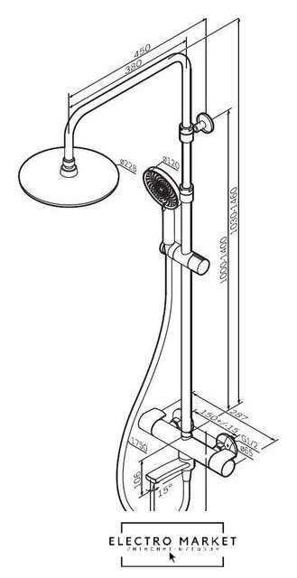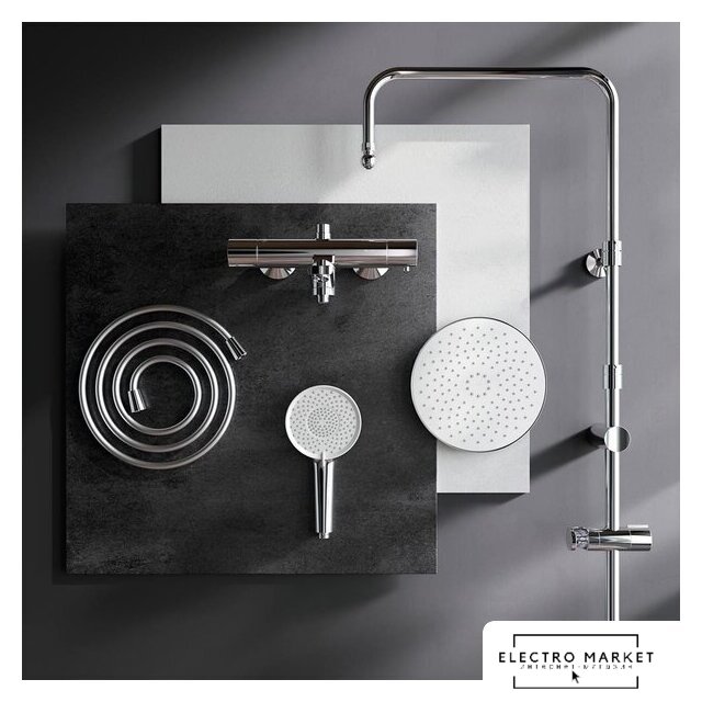 Комплектация | верхний душ, штанга, ручной душ (лейка), держатель лейки, шланг, смеситель, излив для ванны |