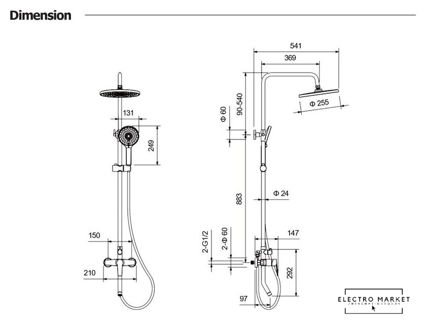 | Диаметр (ширина) верхнего душа | 255 мм |