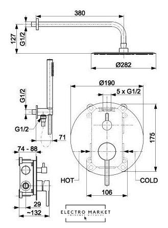 душевая система (250 мм), настенный монтаж, термостатический смеситель