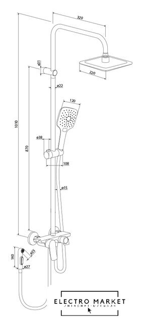 душевая система (с верхним душем), настенный монтаж, термостатический смеситель, верхний душ 224 мм, ручной душ 120 мм