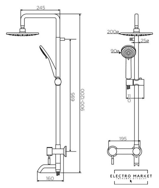 | Диаметр (ширина) верхнего душа | 200 мм |