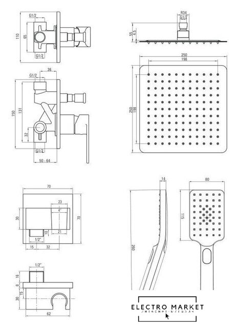 | Диаметр (ширина) верхнего душа | 250 мм |