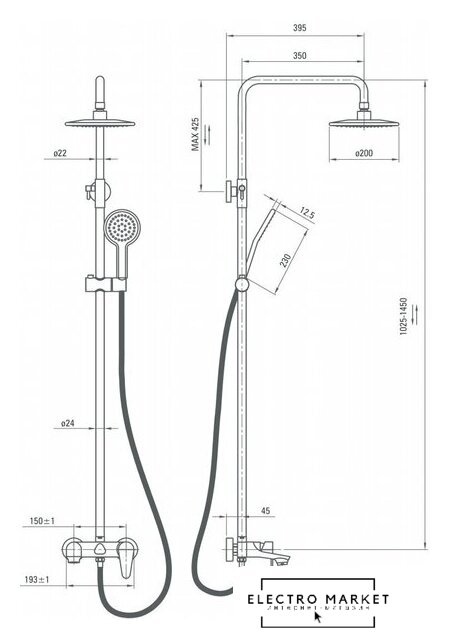 | Комплектация | верхний душ, штанга, ручной душ (лейка), держатель лейки, шланг, смеситель, излив для ванны |