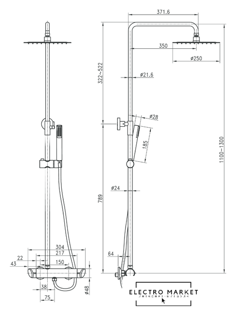 душевая система (с верхним душем), настенный монтаж, термостатический смеситель, верхний душ 250 мм, ручной душ 80 мм