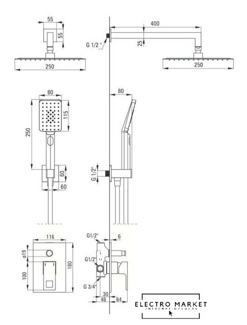 душевая система (250 мм), скрытый монтаж, механический смеситель