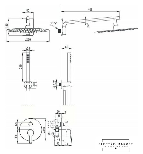 | Диаметр (ширина) верхнего душа | 250 мм |